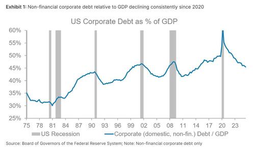 The first question in assessing systemic risk is straightforward: has leverage in the system increased? The short answer is no. Historically, a sustained rise in aggregate corporate debt relative to GDP has been a reliable signal of mounting systemic stress. By that metric, the evidence is not compelling. The overall scale of sub‑investment‑grade lending relative to the economy remains contained. Even after accounting for the growth of private credit, total non‑investment‑grade corporate lending as a share of GDP is broadly unchanged from a decade ago. In fact, aggregate corporate debt‑to‑GDP ratios have declined in recent years. (Exhibit 1). These trends suggest that the stock of riskier corporate borrowing has not expanded to levels consistent with broad‑based systemic vulnerability.