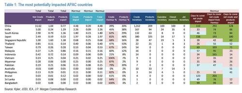 According to JPM calculations, India holds about 33 days of net crude import cover, rising to roughly 70 days when measured against Hormuz‑linked supply, while several Southeast Asian importers—including Vietnam, Myanmar, and the Philippines—maintain much smaller buffers and are already implementing stabilization measures, as are other countries across Asia.