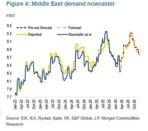 Worse, by the end of next week, JPMorgan expects crude supply cuts to approach 12 mbd, making the deficit highly visible across physical markets.