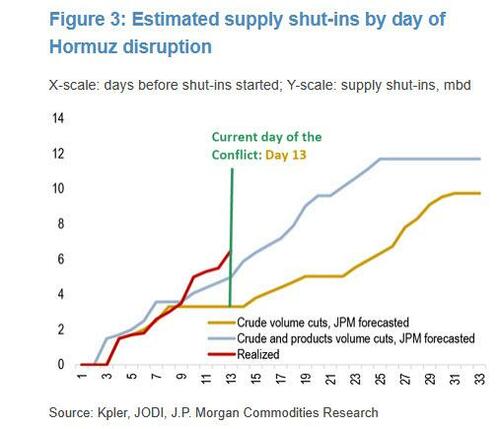 Meanwhile, the dreaded production shut-ins (which take weeks to reverse) have now risen to 6.5 mbd, about 1 mbd above JPM's initial expectations.
