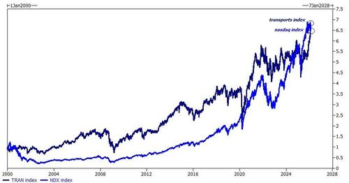 Hat tip to the transportation index, which overtook the NDX in % performance from Jan 2000 to present...