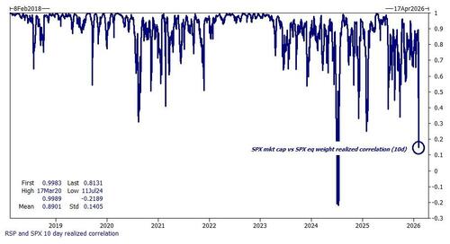 Reminder that the “market of stocks” and the “stock market” are two very different things … the correlation between SPX and RSP collapsed over the last two weeks, at the lows the two had almost 0.0 correlation with each other … recall, these indices have the exact same constituents...