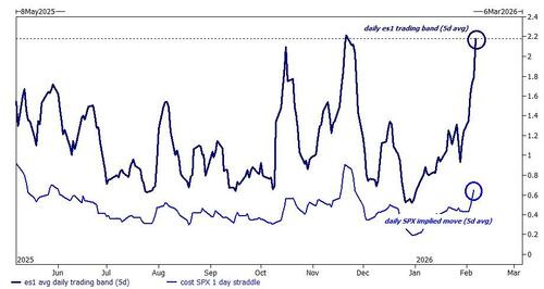 Gamma is still cheap, with the avg daily trading band for e-mini’s at 2.2% over the last week and yet the daily straddles are offered ~65bps...