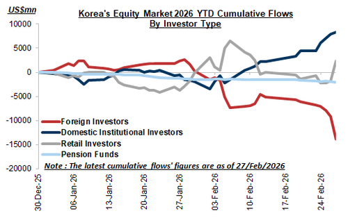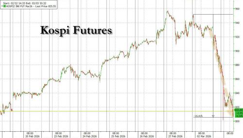 Which is why it could get a lot worse. According to Goldman trader Fred Yin, a combination of 1) the “cockroach moment” last Friday on private credit concerns and 2) geopolitical tensions given weekend US/Iran headlines, mean Kospi had/has a lot of “catch down” to do, meanwhile FX move also amplified the pressure: KRW had one if its biggest drops vs USD in over a year (+2.7% to 1472.35).
