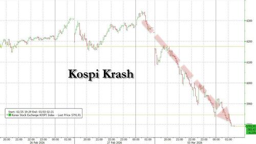 Korea's two "generals", SK Hynix and Samsung Electronics, were both down around 10%. Goldman's Delta One head Rich Privorotsky writes that it's hard to pin a clean catalyst other than to say Asia had priced zero probability of a sustained spike in oil/lng or any serious disruption in the Strait of Hormuz. Given the region’s structural dependence on imported energy, that always felt complacent.