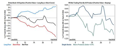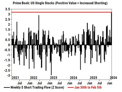 But it was single stocks where the activity was off the charts: according to Goldman, single stocks were heavily net sold (-2.0 SDs one-year) and made up 70% of the total net selling, driven by short sales outpacing long buys (2 to 1). In fact, Goldman's Prime Brokerage notes that "this week’s notional short selling in US Single Stocks was the largest on our record (since 2016, +3.2 -sigma score five-year)"...