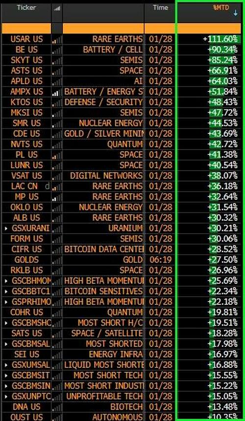 Before today's tumble, this “High Sharpe” backdrop of Asset rally but against “Low Vol” is allowing for the the “High Speculative / Max Degen” -stuff in US Equities to rage again too Jan / YTD (last year’s High-Beta / Retail themes reawakening: Rare Earths, Batteries, Semis, Space, Defense, Nuclear, Miners, Quantum, Autonomous), which is similarly being seen in Cross-Asset Risk-Premia...