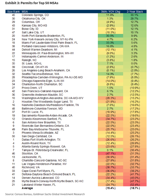 At the metro level, the permit picture is deteriorating across the top 50 metro areas, with permits down 15% from one year ago, and some of the sharpest declines are in places such as Stockton, Richmond, and Cape Coral.