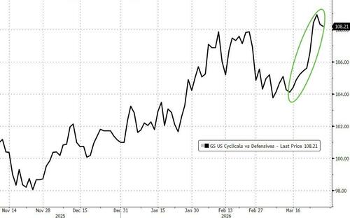 On the equity side, the cyclical parts of the market have outperformed, both outright and relative to defensives (check out ticker GSPRGDPT).