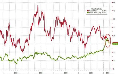 The red line is forward P/E ratio of NVDA; the green line is the forward P/E ratio of XOM.