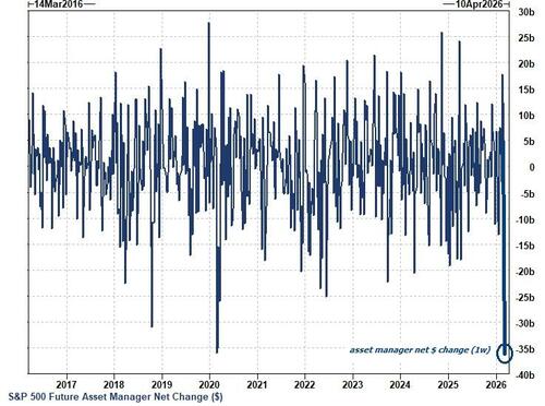 The S&P 500 is lower five of the last six weeks, Goldman Sachs Prime Book data shows US equities have now been sold for four straight weeks, nets and grosses are decreasing, hedge funds are actively adding to short products, and asset managers just sold a record amount of S&P futures (not a typo).