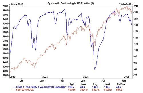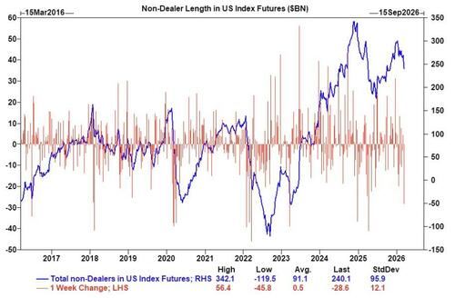 Positioning in US equity futures has also started to reset. Non-dealer positioning declined roughly ~$29bn last week, bringing the total down to ~$240bn versus ~$300bn at the start of the year. Investors remain net long overall, but the speed of the recent reduction highlights that a meaningful amount of discretionary de-risking has already taken place.