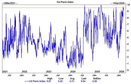 Our Vol Panic Index closed at 9.54 out of 10 – a very elevated reading and one that suggests the market is trading with significantly more internal stress than the headline index drawdown alone would imply. At the same time, several of the positioning rinses that typically accompany a pullback are now underway – gross is lower, macro shorts have surged, systematic length is being cut, futures positioning has come in, and vol buyers have re-emerged aggressively.
