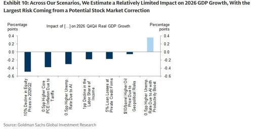 At the same time, several downside risks that had previously been discussed mostly in theory are now beginning to materialize. Oil has surged toward ~$100 on the Iran conflict, payrolls recently surprised to the downside, equities have corrected roughly ~5%, and early signs of stress are emerging in parts of the private credit ecosystem. None of these developments individually would derail the cycle. But as GS Research highlighted in February, what matters more is the stacking of shocks – and the combination of higher oil, weaker equities, tighter financial conditions, and emerging credit stress is now pushing the market into a more fragile regime (link).