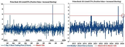 After rising +8.3% last week, US-listed ETF shorts rose another +12.4% – the third-largest weekly increase on our record since 2016, behind only the April 2025 Liberation Day episode and roughly on par with March 2020 during Covid. As a share of total US gross MV on the Prime book, short exposure in macro products now sits at the highest level since September 2022 and in the 97th percentile on a five-year lookback.