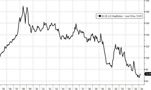 For a tradeable expression, we highlight our recently rebalanced Stagflation pair trade (GSPUSTAG Index). The Long basket (GSXUSTGL) consists of commodity equities and defensive compounders that historically perform well in stagflationary environments. The Short basket (GSXUSTGS) includes low-quality consumer discretionary, semis/hardware, consumer finance/regional banks, high-beta oil-input cyclicals, and high-flier tech names that historically struggle during stagflationary regimes.