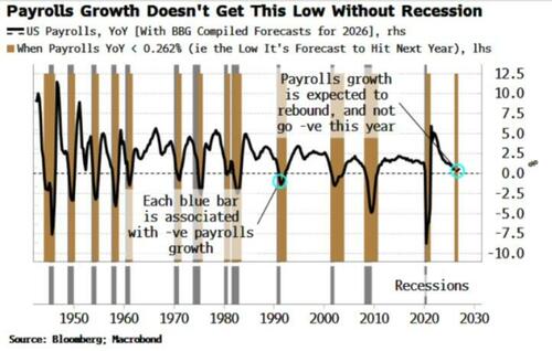 What payrolls alone is expected to do is unprecedented. Its growth has never been as low as it’s seen reaching in 2026 and then reversed course. It has always subsequently fallen further and into contraction territory, signaling an imminent recession.