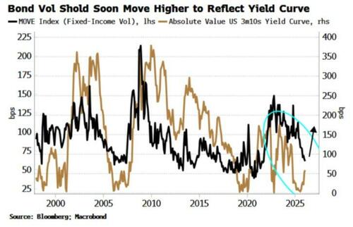 Furthermore, greater fiscal interference in monetary policy will lead to higher volatility, which also points to higher yields. Bond vol has been repressed in part due to an increased preference for funding at the shorter end of the curve. That strategy contains the seeds of its own destruction though: the steeper yield curve that’s likely to result is a volatility machine, as the scope of potential paths between forward and spot rates widens.