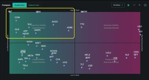 Software stocks experienced the week's largest declines, with IGV down ~23% year-to-date. We can use our four-quadrant Compass to visualize how the market is pricing in volatility (IV Rank, y-axis) and directional risk (Risk Reversal Rank, x-axis).