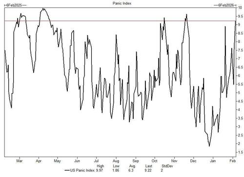 Our favorite indicator: the last reading of the GS Panic Index was 9.22 based on 1-month S&P implied volatility, VIX volatility, S&P 1m put-call skew, and the S&P term structure slope (1m vs. 3m).