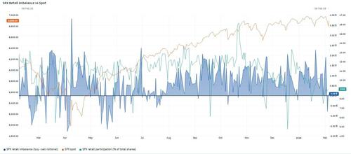 Coming off a year of remarkably robust retail flow, the cohort has already demonstrated less willingness to “buy all dips” as seen by the latest 2-day net imbalance of $690mm to sell but so far they've remained active.