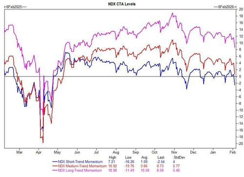 CTAs have sold $6.25bn in US equities since the start of the year and positioning now sits in the 70s percentile range on both a 1y and 5y lookback.