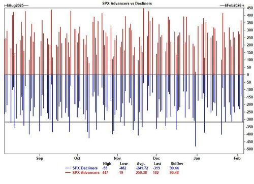137 more companies in the S&P were down on the day yesterday than up. The spread is widening out as investors continues to trade thematically, but these levels are not overly concerning at the moment.