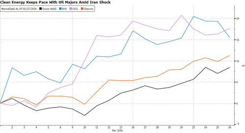 Shares of China’s leading battery and EV maker Contemporary Amperex Technology and BYD have both gained more than 15% since the war began in Iran, outperforming that of Exxon Mobil and Chevron.