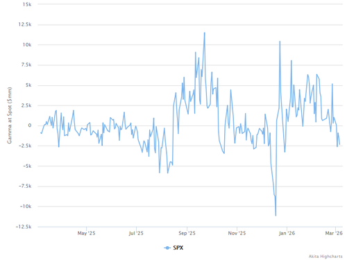Also of concern is that after spending much of 2026 well in the green, dealer gamma is now the most negative it has been this year, meaning that instead of buffering moves, gamma now serves as an accelerant.