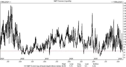 And move it will, as it doesn't take much to push the emini futures: as shown below, top-of-book depth is down to levels last seen around the Liberation Day plunge.