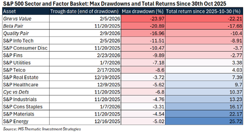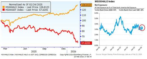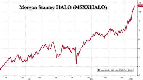Lastly, and going back to how to trade if this is not yet peak fear, Morgan Stanley doubles down writing that the sectors that are benefiting from the AI disruption fear sit within the HALO – ‘Hard Asset Limited Obsolescence’ thematic (which every bank is now pretending is their own, see JPM and Goldman). For those who are worried the disruption has more to go then this group has (much) more to run: