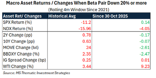 How unusual was this last 4 month period been? According to Morgan Stanley, since 2021 when looking at rolling windows of 20% declines in the bank's Beta basket (MSZZBETA), SPX during those periods has been down -11.2% on average, whilst the NDX has been down -16% on average. But one feature of these large Beta drawdowns since 2021 over equivalent time periods has been that macro financial conditions were tighter - not looser as we have seen here: since end of Oct rates are lower, and the $ is weaker.