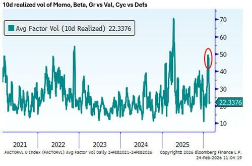And while implied vol (aka VIX) remains relatively subdued, as a consequence of all this chop, 10d realized vol of factors already spiked in early Feb to highest since Tariff sell-off in April 2025, and prior to that Nov-2022 but is now settling back down.