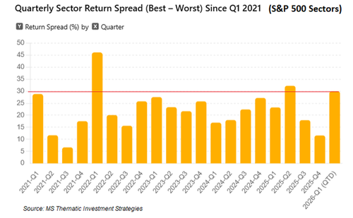 Another curiosity: when looking back at Quarterly returns of S&P Sectors since 2021, this current Quarter is seeing the 3rd largest quarterly return spread between the winning S&P 500 sector and the losing S&P 500 sector since 2021, preceded only by Q2 2025 and Q1 2022.