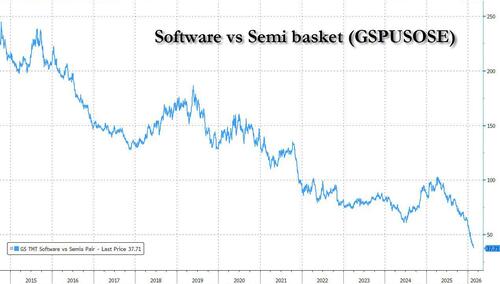 Meanwhile, even as financial conditions have become easier (with the Fed starting QE Lite and on pace for more cuts), hedge fund flows YTD have also become extreme in the context of buying AI beneficiaries and Semis, vs the selling of Software that has become somewhat indiscriminate. As shown below, Goldman's Software vs Semi basket just hit a new record low...