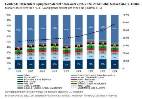 A visual summary of the data center equipment maker power share (for a far more detailed analysis, please see "Behind The $500 Billion Data Center Boom: Here's Who Makes All The Key Components").