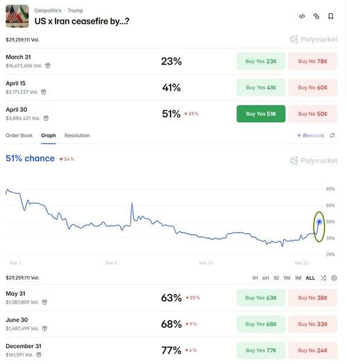 The prediction market odds of a ceasefire by April 30th are now above 50%...