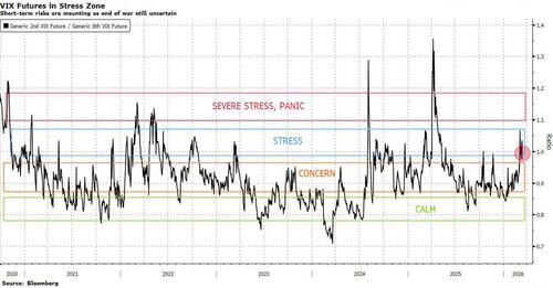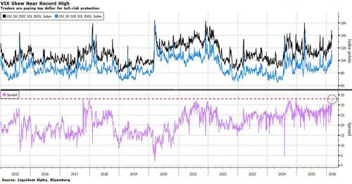 There are some signs that fear might be peaking. VIX skew is near all-time highs relative to at-the-money volatility, implying that the market is paying up hard for tail protection. That’s a classic “hallmark of maximum pessimism,” according to Liquidnet Alpha cross asset sales specialist Anthony Benichou. Still, forced deleveraging and systematic flows can create sharp moves in both directions, he warns.
