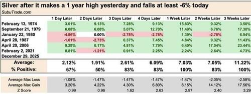 Here's every case when Silver fell more than -6% from a 1 year high (h/t @SubuTrade): Silver up 6 out of 6 times, 1 week later...