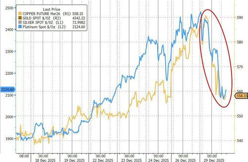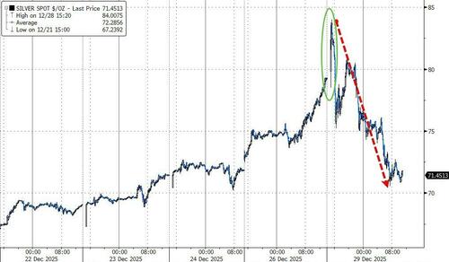 But, it is the precious metals markets that warrant our first attention today with silver and gold pumped (to new record highs) then dumped (at multi-year scale) amid 'no smoking gun' per se (fragile liquidity, export controls, margin hikes, ETF extremes, China liquidations)...