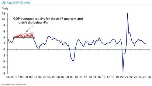 Between Q2 1996 and Q3 2000, every quarter saw US growth at an annualised rate of over 4% with an average rate around 4.5%. In this cycle, US growth has been strong since Q1 2023 but has only averaged 2.6% annualised. Could AI Capex and productivity gains take us back to those rates from the late-1990s, whether prolonged or temporarily due to a bubble?