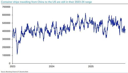 What if US-China trade tensions improved…? The current trade truce lasts until 10 November 2026, but that’s been extended before. Indeed, in Trump’s first term, the US and China reached a Phase One trade deal just before the pandemic. And despite expectations for a collapse in bilateral trade as tariffs surged, the number of container ships going from China to the US has remained within its range over 2023-24.