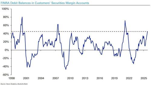 Margin debt has seen spikes consistent with late-stage bull markets. This is the total of all debit balances in securities margin accounts reported by FINRA. As our credit strategists have outlined in more depth, the speed with which investors are levering up on stocks compares to the end of the dot com bubble, the pre-GFC period, and the post-Covid stimulus-fuelled rally.