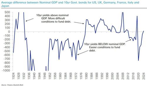DM Funding costs (10yr ylds as a proxy) overall are now getting close to Nominal GDP. In the post GFC period of high debt and financial repression, yields were consistently below nominal GDP helping the funding situation.... This period is over. Average funding rates will still be lower but if long-end yield stay elevated this will increase from here.