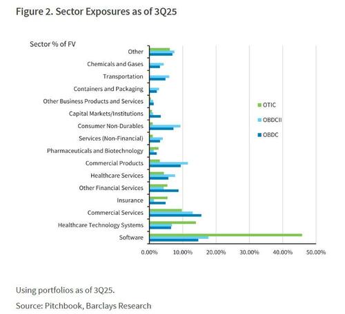 All of this comes just days after Blue Owl Capital, which has extensive exposure to software loans, blocked investors from making withdrawals from one of its private credit funds (see "The "Canary In The Coal Mine" Just Froze: Here Is What Is Really Happening At Blue Owl") making UBS's tail risk scenario far more likely and raising anxiety about the loans issued by direct lenders, especially to software firms which as we reported previously represent as much as 45% of Blue Owl's Technology Income Corp (OTIC) book.