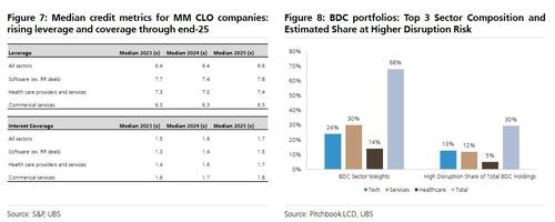 Making matters worse, once the contagion begins, it won't stop until it infect the broader credit space. As UBS writes, "private credit stress is unlikely to remain contained. Borrowers increasingly tap both private and syndicated loan markets, with overlapping issuer and sector exposures and shared sponsors. Services and tech represent 15–20% of leveraged loan portfolios, mirroring private credit."