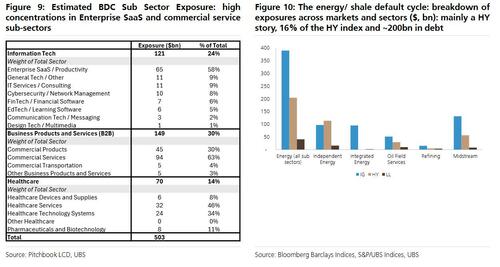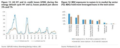 Taking a step back, while accelerating AI disruption is clearly the trigger for the coming Private Credit calamity, the "most acute risk is a sector-specific shock triggering cascading defaults" UBS writes. Historical precedents, such as telecom in 2001 and energy in 2016, show how concentrated defaults can drive market-level default rates. One sector can account for 55-80% of market level defaults: as regular readers know, today’s private credit portfolios are heavily weighted toward services (25–30%), technology (20–25%), and healthcare (15–17%).