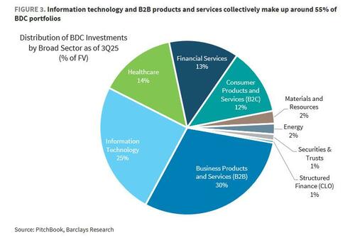 For those pressed for time, the arc of the crisis goes something like this. In late January and early February, UBS and Barclays independently published research reports revealing the extensive exposure of the private credit industry to software loans. As the following Barclays chart revealed, business products and services accounted for about 30% of private credit portfolios as of 3Q25, while information technology made up around a quarter, or 55% of the total loan book when combined.