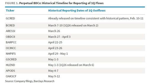 Perhaps Barclays' optimism will prevail. On the other hand, now that we have indeed crossed the tipping point, we are about to face a barrage of BDC Q1 outflow disclosures and as Barclays warns "it is possible for a string of outflow disclosures to hit over the next few weeks, if other BDCs also disclose flows earlier than they have historically. The combination of more concentrated disclosure over a shorter period of time and the likely negative slant of the information could be a headwind to BDC spreads, despite their recent material widening."