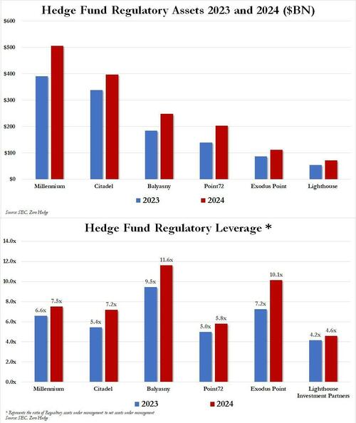 Why is this important? Because as we explained most recently last April, in "Absolutely Spectacular Meltdown": The Basis Trade Is Blowing Up, Sparking Multi-Trillion Liquidation Panic", multi-strat funds like Millennium, Citadel, Point72 and Balyasny apply massive leverage via repos to multiply their assets under management into regulatory assets which in some cases are 11x higher.